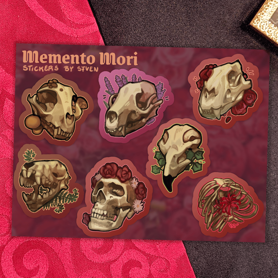 7 stickers, all featuring various skulls (or chest) adorned by different type of death-aligned plants. Designs include: raccoon, hawk, lion, human, bat, domestic cat, domestic dog, human chest.