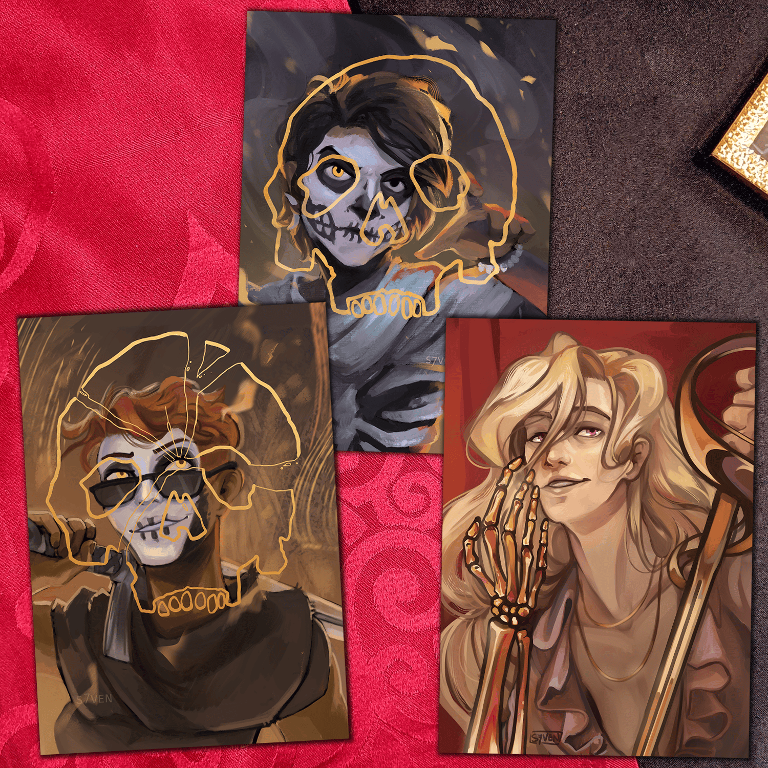 Prints on 350g satin paper covered with soft touch foil with a gold foil finish, featuring Harrowhark, Ianthe and Gideon from The Locked Tomb series.